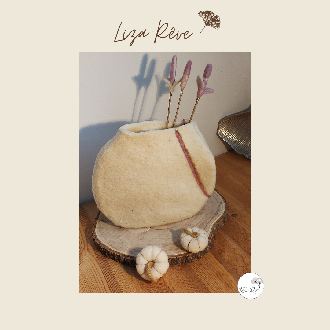 Modelé avec patience et passion à partir de laine de mouton cardée à la main ce vase est une pièce unique d’art textile.